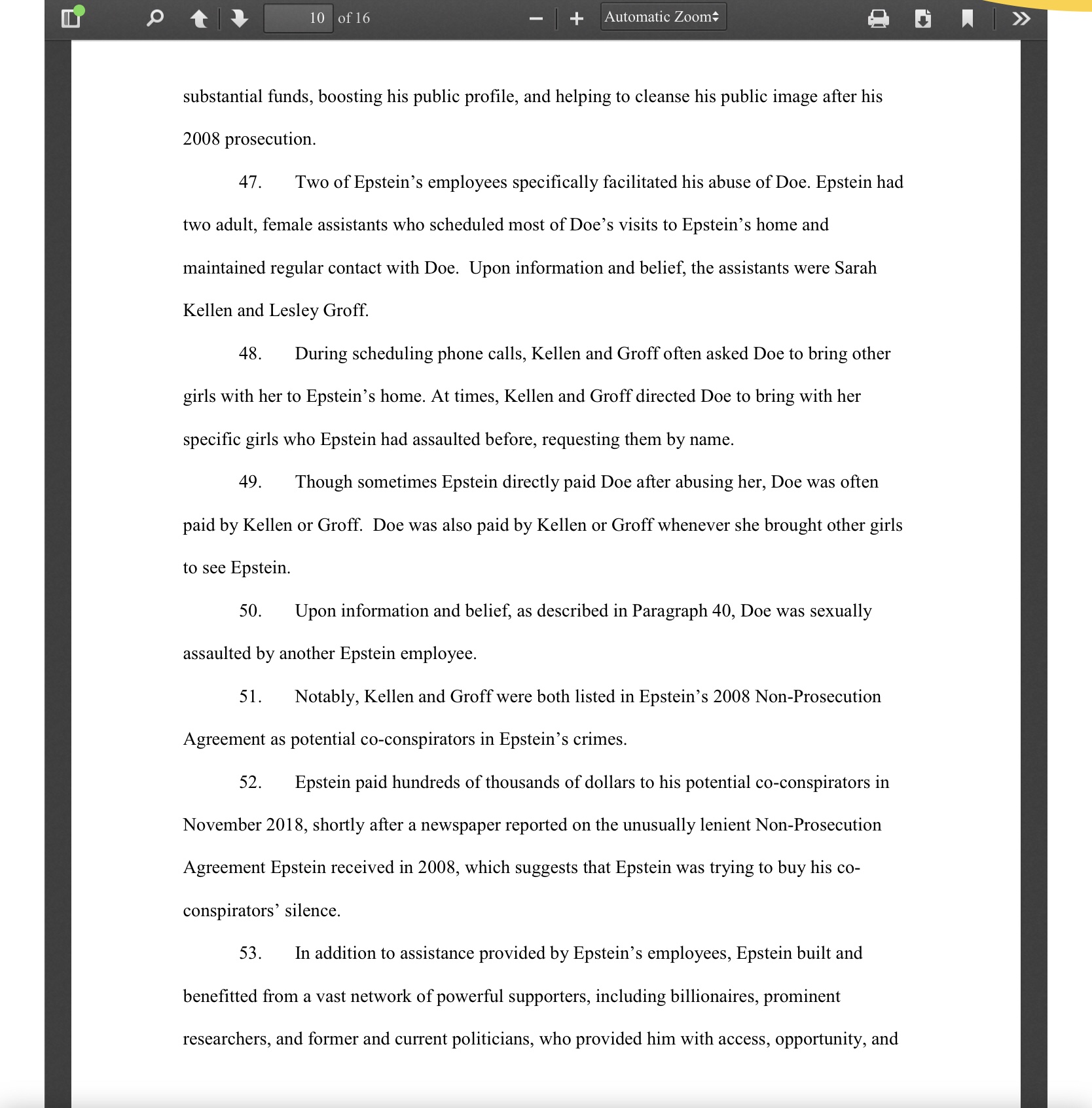 But she more recently said, via her lawyer, she was shocked by the allegations against Epstein. Groff said she’d been “besmirched” by the allegations.,