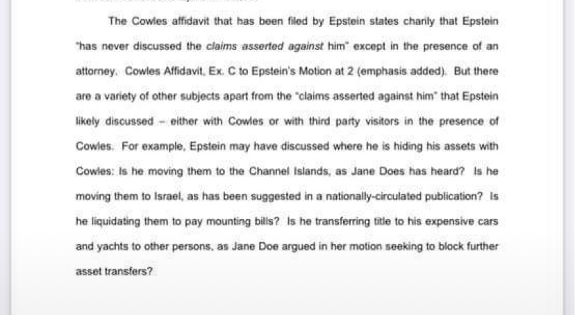 Legal argument during Jane Doe v Epstein 2008 also covered the possibility of Cowles having knowledge about conjecture concerning Epstein sending money to the Channel Islands and Israel.